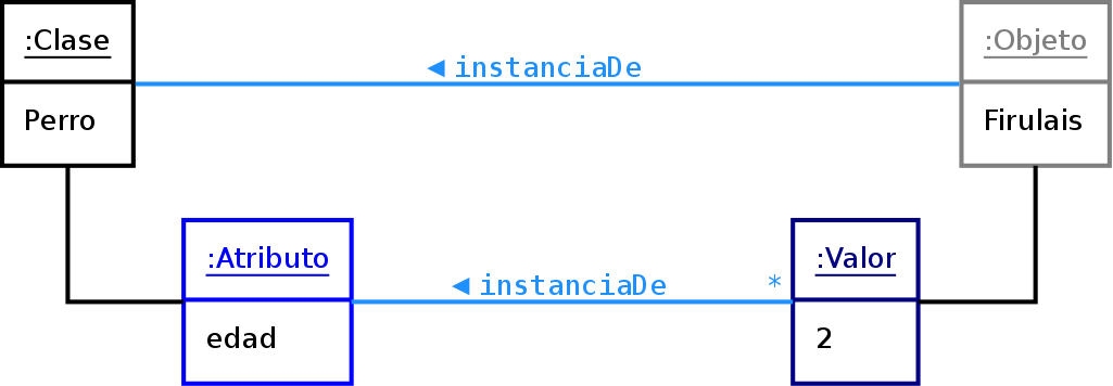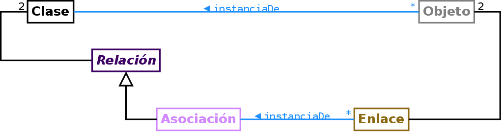 Los dos conceptos básicos de la OO son el objeto y la clase. en el diagrama se representan como dos clases que están relacionadas por la asociación instanciaDe, esto se lee como: un Objeto es una instancia de una Clase. Para entenderlo mejor daré un ejemplo: