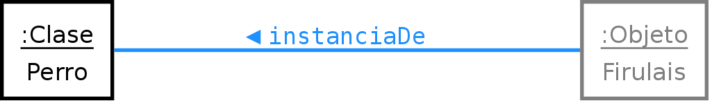 En éste diagrama de objetos se puede ver el objeto firulais, que es una instancia de la clase Perro. Esto es más o menos como el caso de los conjuntos y sus elementos: La clase es el conjunto y el elemento es el objetos. La clase es algo así como el molde para hacer los objetos. Esto último quiere decir que con la clase Perro se pueden hacer muchos perros, como por ejemplo, un firulais y también una lassie.