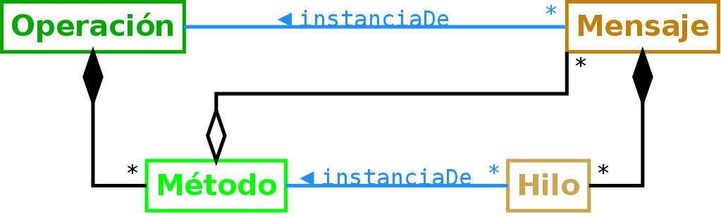esto para llamar la atención sobre la clase Hilo. Ésta es la instancia de Método. Realmente es el proceso que «corre» todos los mensajes del método. Utilicé el término «hilo», aunque no es de la terminología de objetos, pues este proceso es realmente un proceso liviano, comparte memoria con otros hilos.