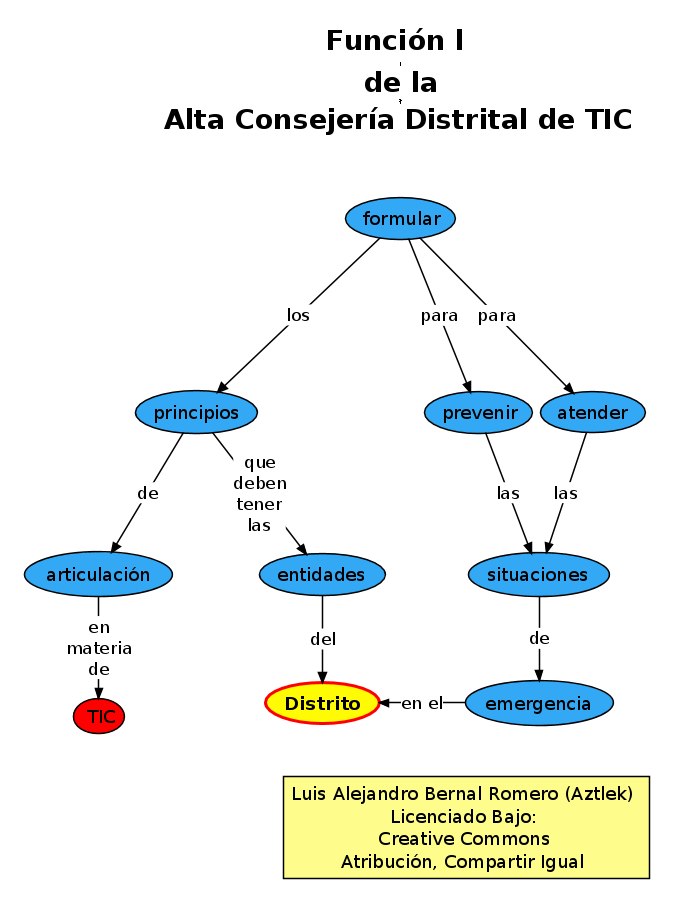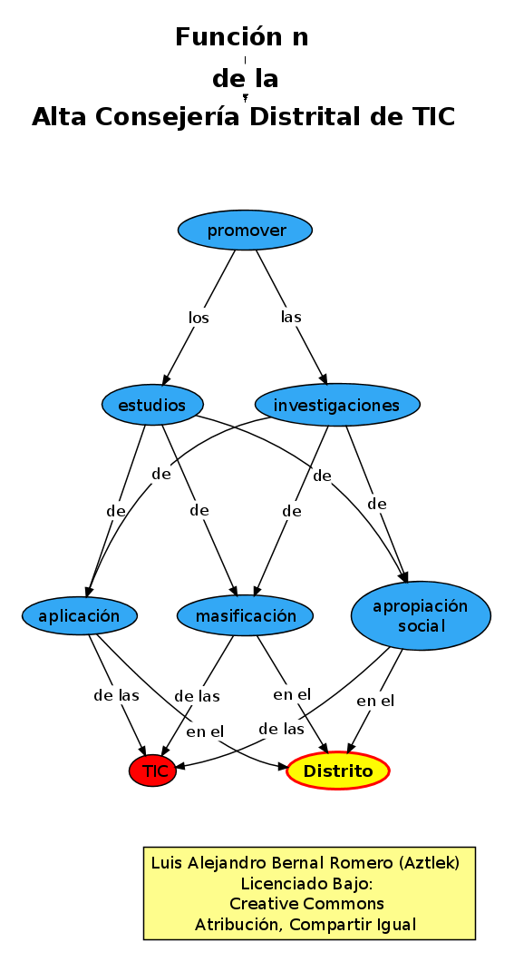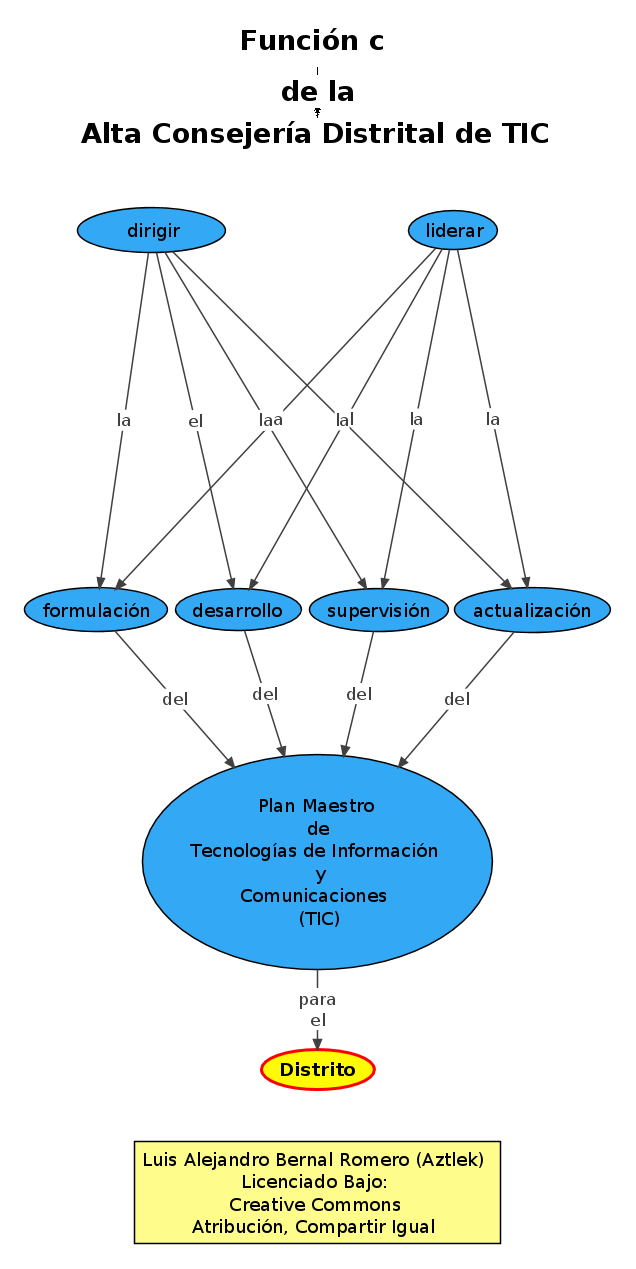 Este análisis toma cada una de las funciones de la Alta Consejería de TIC y hace lo siguiente: Se transcribe el texto desde el Decreto 77 de 2012, para que el lector tenga un contexto. A continuación se representa ese texto en forma de mapa conceptual. Teniendo estas dos representaciones se procede al análisis. Éste se hace con base en las siguientes categorías: