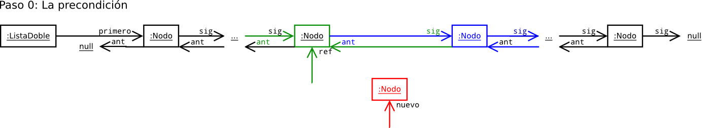 Como puedes ver tenemos tres entradas: la lista, una referencia ref que indica donde se debe insertar y una referencia al nuevo nodo. Como se ve en la postcondición el nuevo nodo debe quedar al frente de la nueva referencia.