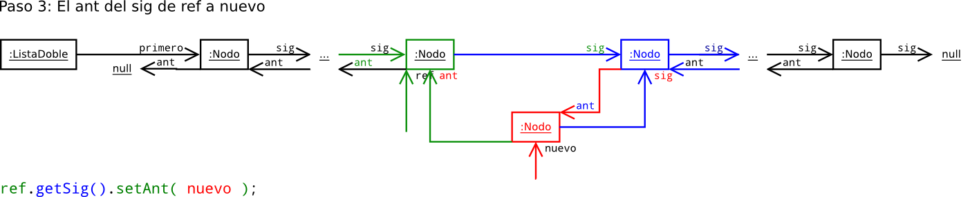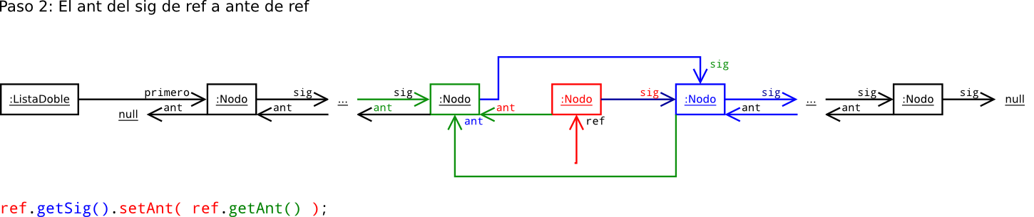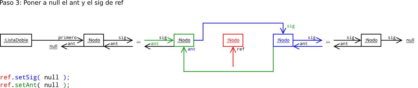 Que simplemente pone el siguiente de nuevo a referenciar al siguiente de ref. Fíjate que debajo del diagrama e puesto la sentencia equivalente en java, que además está coloreada para que te puedas guiarte más fácilmente.