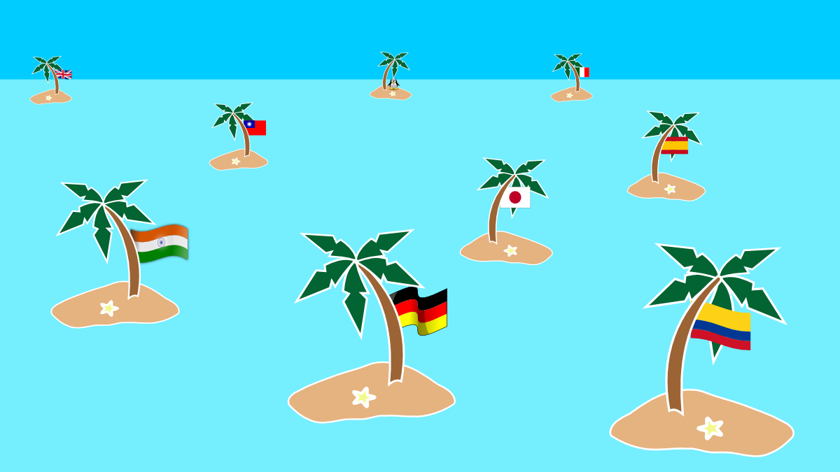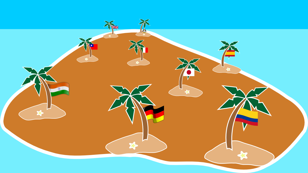 Si bien es un paisaje paradisiaco, todos los sistemas son como islas, no se comunican y no sólo por que no hay canales entre ellos, sino que también hablan distintos lenguajes (simbolizado por las banderas).